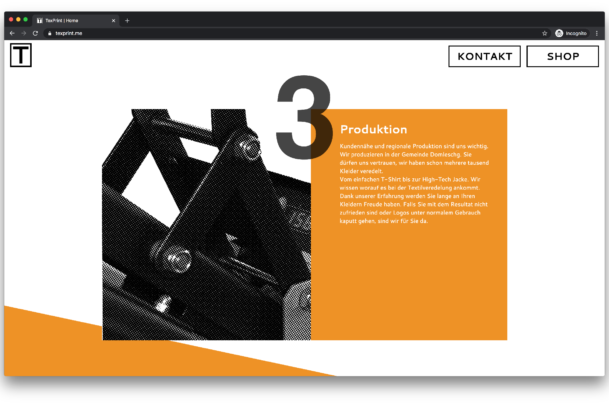 I had the chance to work on a simple website for TexPrint. The main purpose is to take the visitor through the production process, show some recent references and ultimately lead them to the store. The website itself is straight forward with a backend based on the filed based CMS Kirby which allows for easy editing of the websites content as well as expandability for the future.